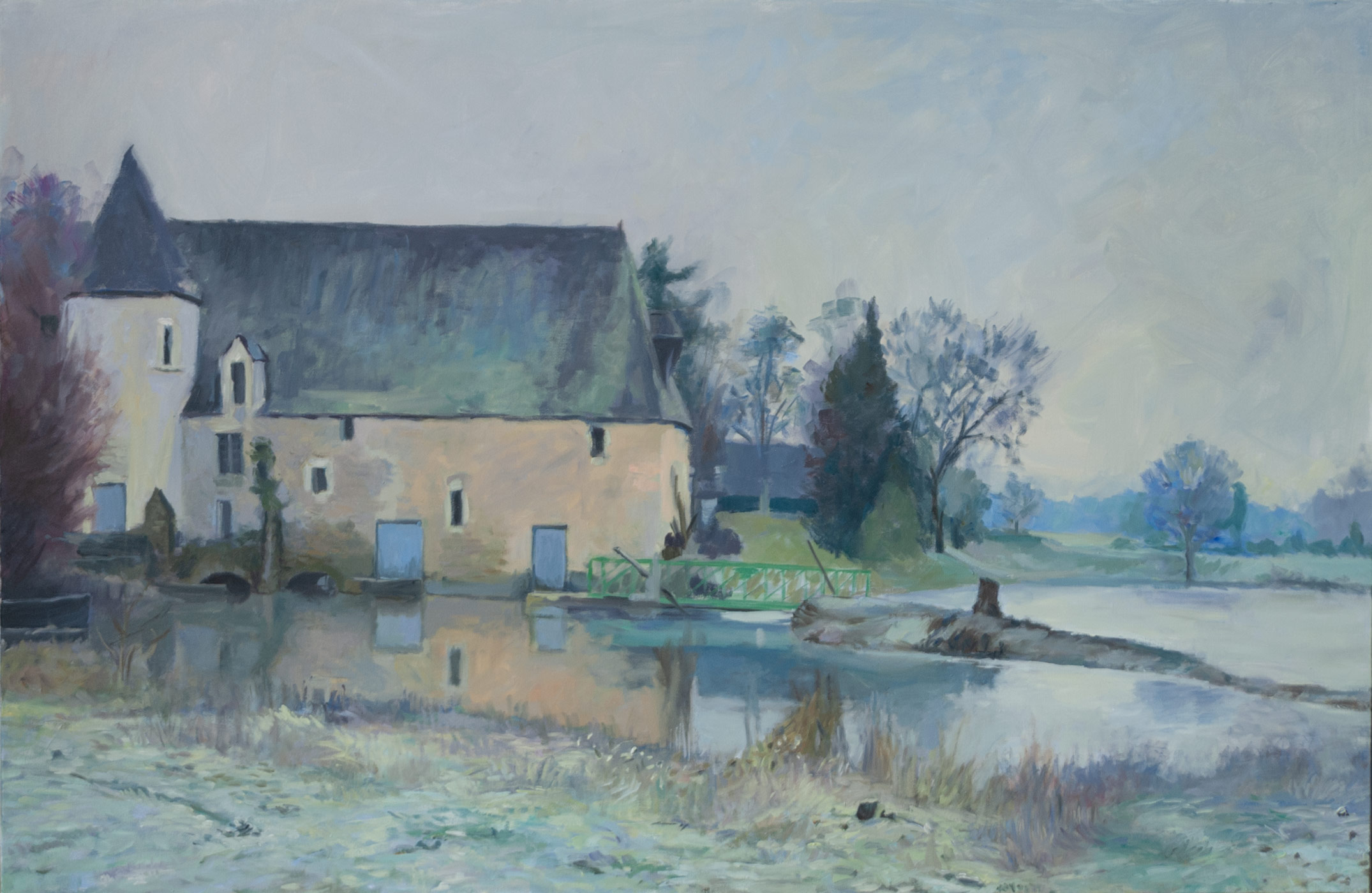 Huile sur toile, réalisée à l’hiver 2024, représentant le moulin de Corzé.